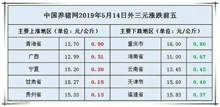 2019年5月14日,据中国养猪网猪价系统监测全国外三元均价为15.09元/公斤,较昨日持平,较上周上涨0.01元/公斤。今日猪价涨幅维持在0.01-0.90元/公斤,跌幅维持在0.03-0.80元/公斤。