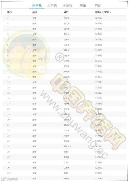 今日最高猪价:甘肃省外三元均价为18.27元/公斤。今日最低猪价:海南省外三元均价为11.00元/公斤。