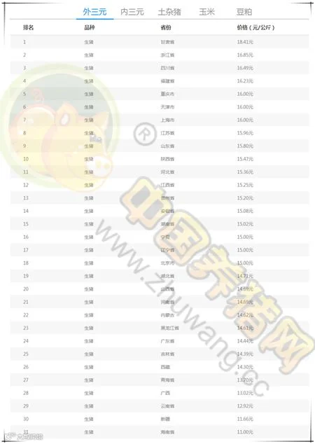 今日最高猪价:甘肃省外三元均价为18.41元/公斤;今日最低猪价:海南省外三元均价为11.00元/公斤。