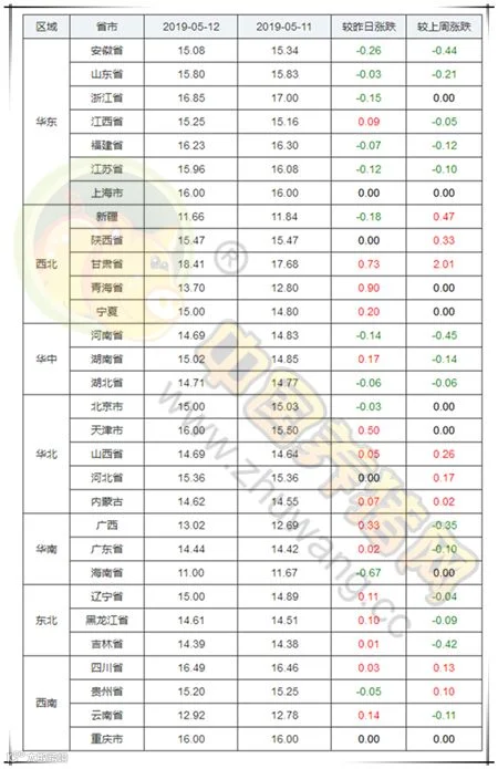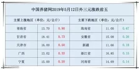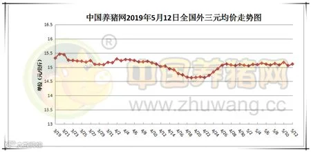 2019年5月12日,据中国养猪网猪价系统监测全国外三元均价为15.11元/公斤,较昨日上涨0.05元/公斤,较上周下跌0.03元/公斤。今日猪价涨幅维持在0.01-0.90元/公斤,跌幅维持在0.03-0.67元/公斤。