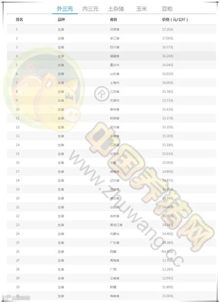 今日最高猪价:甘肃省外三元均价为17.20元/公斤。今日最低猪价:海南省外三元均价为11.00元/公斤。