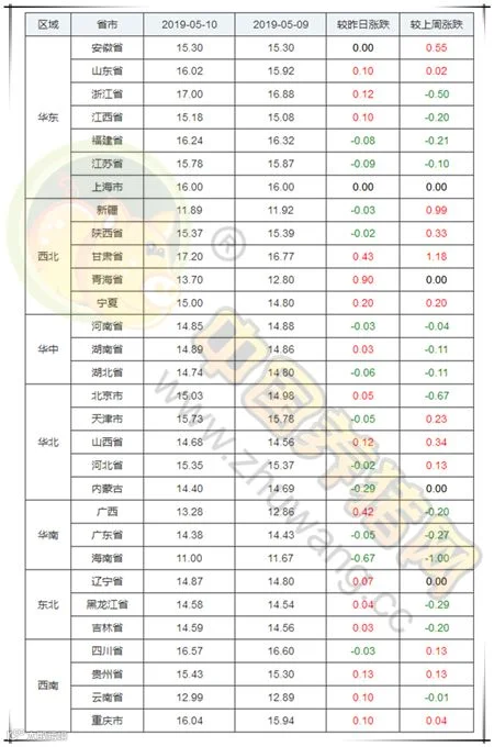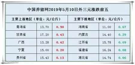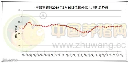 2019年5月10日,据中国养猪网猪价系统监测全国外三元均价为15.17元/公斤,较昨日上涨0.09元/公斤,较上周上涨0.08元/公斤。今日猪价涨幅维持在0.03-0.90元/公斤,跌幅维持在0.02-0.67元/公斤。