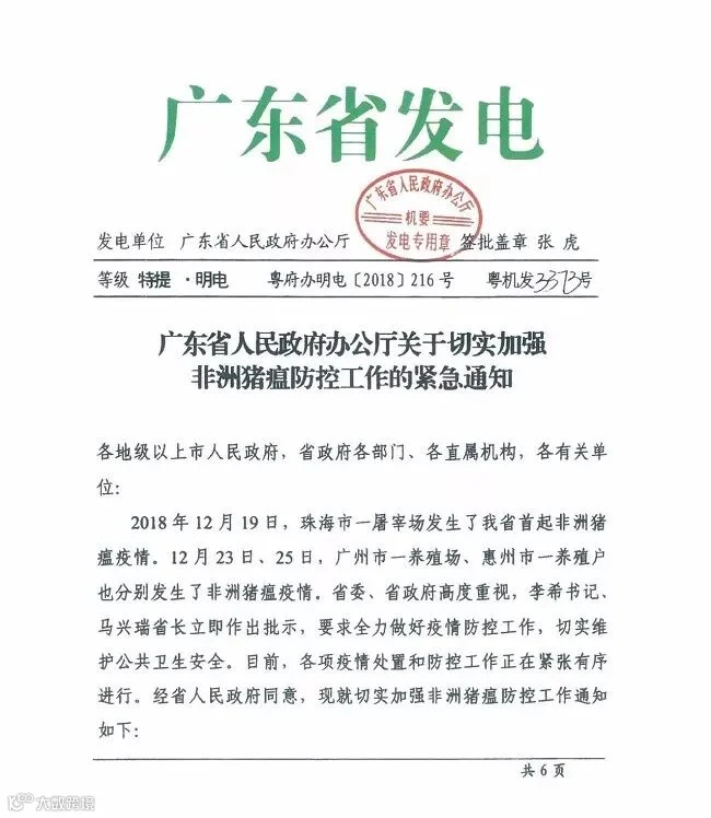 广东省人民政府办公厅关于切实加强非洲猪瘟防控工作的紧急通知