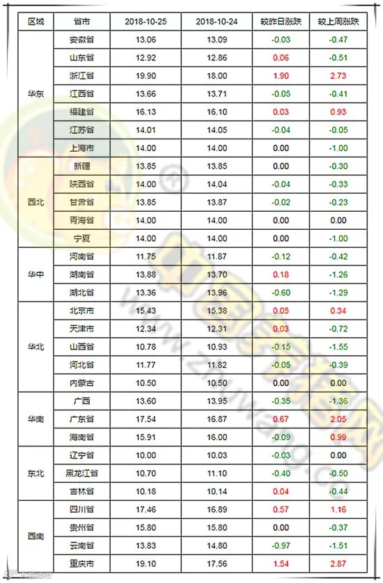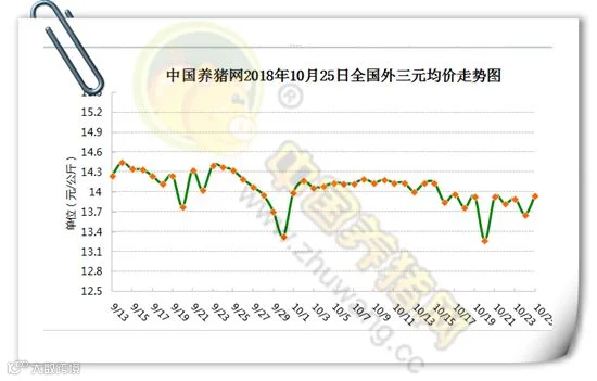 2018年10月25日,据中国养猪网猪价系统监测全国外三元均价为13.95元/公斤,较昨日价格上涨0.29元/公斤,较上周价格上涨0.14元/公斤,涨幅维持在0.03-1.90元/公斤,跌幅维持在0.02-0.97元/公斤。纵观全国下跌地区较多,上涨地区较少,浙江、重庆、广东、四川、湖南、山东、北京、吉林、福建、天津上涨,其余省份下跌或持平。