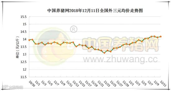 2018年12月11日,据中国养猪网猪价系统监测全国外三元均价为14.19元/公斤,较昨日上涨0.06元/公斤,较上周上涨0.23元/公斤,涨幅维持在0.04-0.68元/公斤,跌幅维持在0.01-1.17元/公斤。