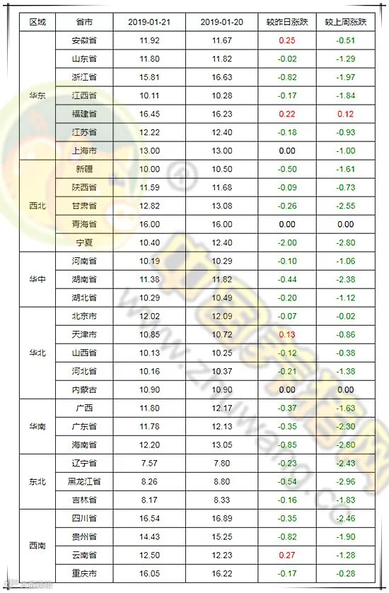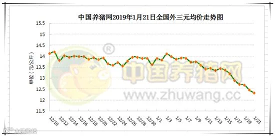 2019年1月21日,据中国养猪网猪价系统监测全国外三元均价为12.32元/公斤,较昨日下跌0.14元/公斤,较上周下跌1.12元/公斤,涨幅维持在0.13-0.27元/公斤,跌幅维持在0.02-2.00元/公斤。