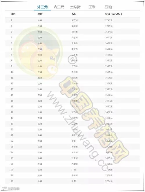 今日最高猪价:浙江生猪外三元均价为17.43元/公斤。今日最低猪价:新疆外三元均价为12.94元/公斤。