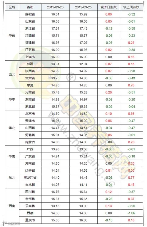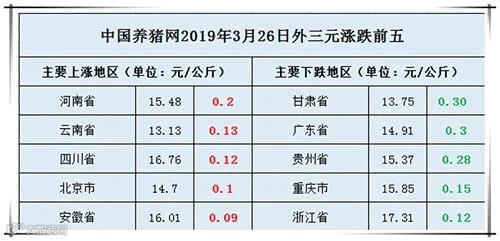 2019年3月27日,据中国养猪网猪价系统监测全国外三元均价为15.18元/公斤,较昨日下跌0.03元/公斤,较上周下跌0.14元/公斤。今日猪价涨幅维持在0.01-0.20元/公斤,跌幅维持在0.04-0.30元/公斤。