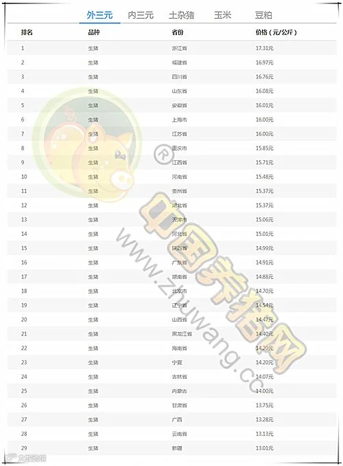 今日最高猪价:浙江生猪外三元均价为17.31元/公斤。今日最低猪价:新疆外三元均价为13.01元/公斤。