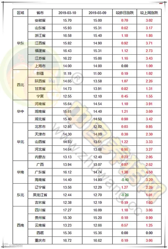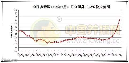 2019年3月10日,据中国养猪网猪价系统监测全国外三元均价为15.03元/公斤,较昨日上涨0.76元/公斤,较上周上涨2.78元/公斤。今日猪价涨幅维持在0.10-1.38元/公斤,跌幅维持在0.26-0.40元/公斤。