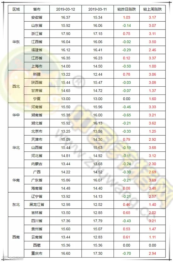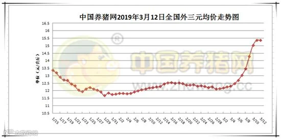 2019年3月13日,据中国养猪网猪价系统监测全国外三元均价为15.37元/公斤,较昨日上涨0.01元/公斤,较上周上涨2.89元/公斤。今日猪价涨幅维持在0.08-1.03元/公斤,跌幅维持在0.02-0.70元/公斤。