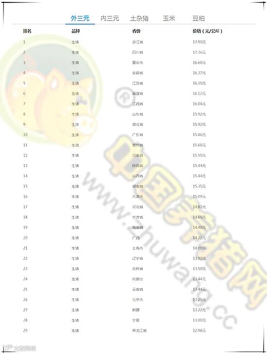 今日最高猪价:浙江生猪外三元均价为17.90元/公斤。今日最低猪价:黑龙江外三元均价为12.98元/公斤。