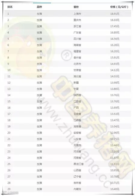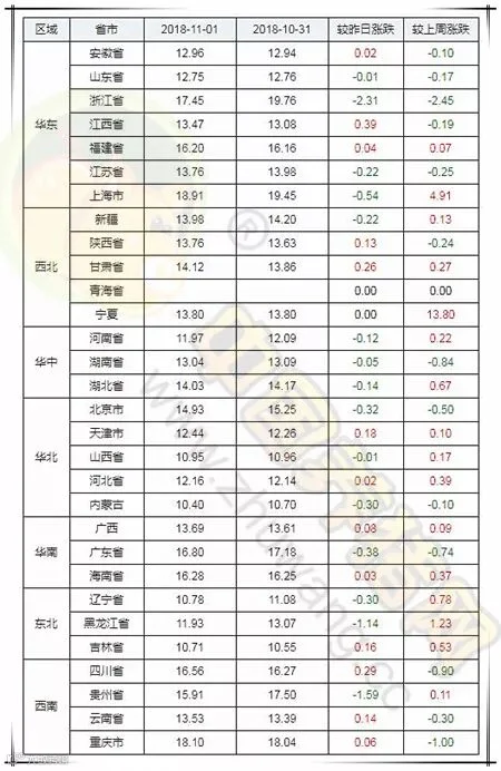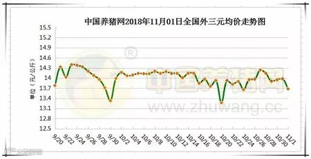 2018年11月01日,据中国养猪网猪价系统监测全国外三元均价为13.68元/公斤,较昨日价格下跌0.30元/公斤,较上周价格下跌0.27元/公斤,涨幅维持在0.02-0.39元/公斤,跌幅维持在0.01-2.31元/公斤。纵观全国,下跌地区较多,上涨地区较少,安徽、江西、福建、陕西、甘肃、天津、河北、广西、海南、吉林、四川、云南、重庆上涨,其余省份下跌或持平。