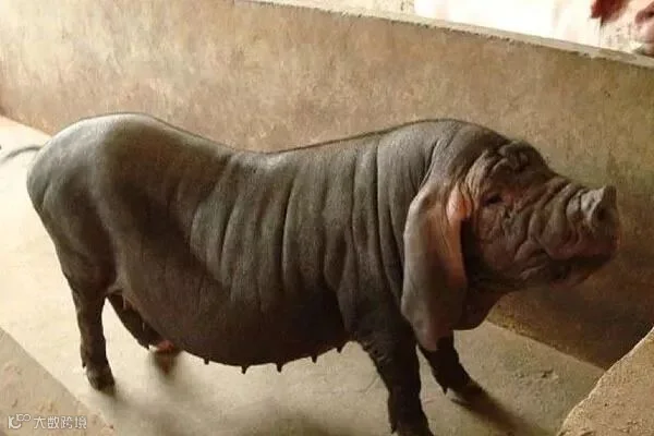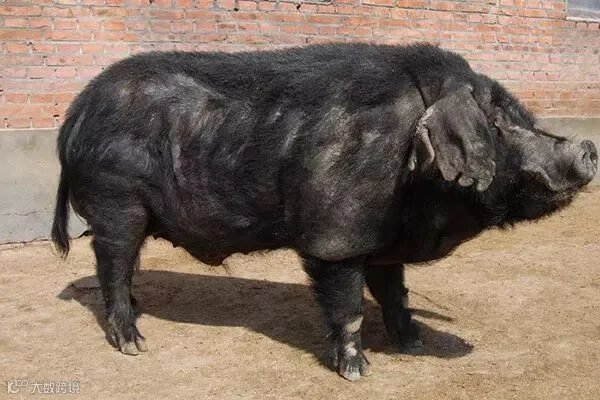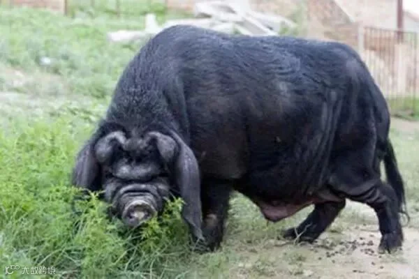 太湖猪体型中等,被毛稀疏,呈黑或青灰色,四肢、鼻均为白色,腹部紫红,头大额宽,额部和后驱皱褶深密,耳大下垂,形如烤烟叶。