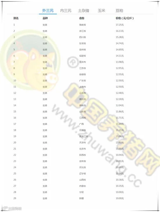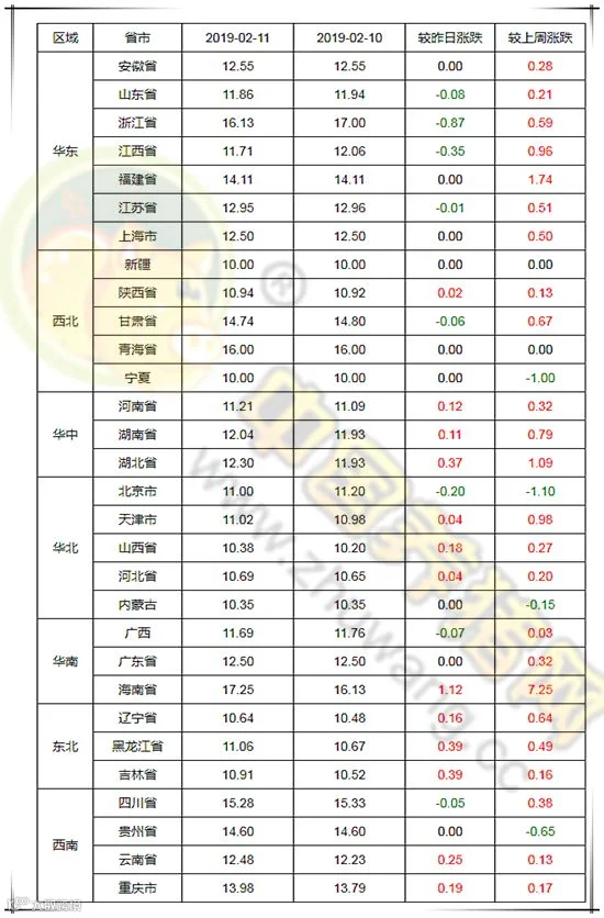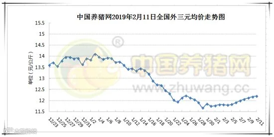 2019年2月11日,据中国养猪网猪价系统监测全国外三元均价为12.21元/公斤,较昨日上涨0.03元/公斤,较上周上涨0.41元/公斤,涨幅维持在0.02-1.12元/公斤,跌幅维持在0.01-0.87元/公斤。