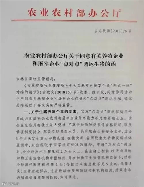 继黑龙江生猪可以在本省调运后,目前网络上流传一份10月19日印发的《农业农村部办公厅关于同意有关养殖企业和屠宰企业“点对点”调运生猪的函》,文件指出,吉林省养殖企业和屠宰企业在省内可实施“点对点”调运生猪。目前吉林省生猪价格在5元/斤上下,若此消息属实,无疑利好吉林猪价。