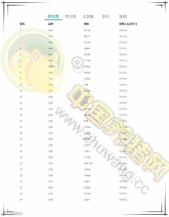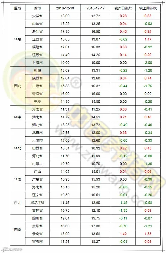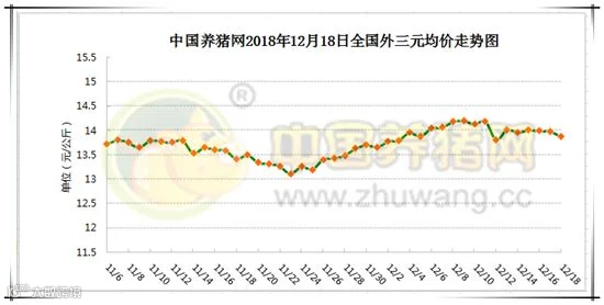 2018年12月18日,据中国养猪网猪价系统监测全国外三元均价为13.87元/公斤,较昨日下跌0.11元/公斤,较上周下跌0.32元/公斤,涨幅维持在0.01-1.42元/公斤,跌幅维持在0.01-1.45元/公斤。
