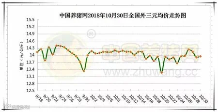 2018年10月30日,据中国养猪网猪价系统监测全国外三元均价为13.95元/公斤,较昨日价格上涨0.04元/公斤,较上周价格上涨0.05元/公斤,涨幅维持在0.01-2.63元/公斤,跌幅维持在0.01-1.13元/公斤。纵观全国,下跌地区较多,上涨地区较少,山东、福建、河南、北京、河北、内蒙古、黑龙江、吉林上涨,其余省份下跌或持平。