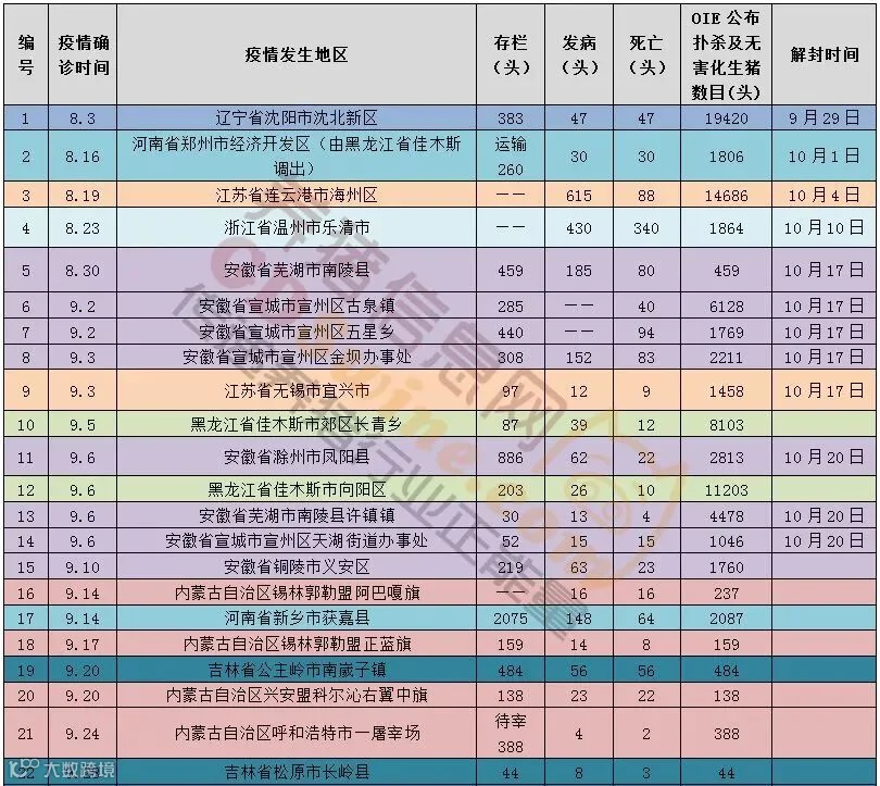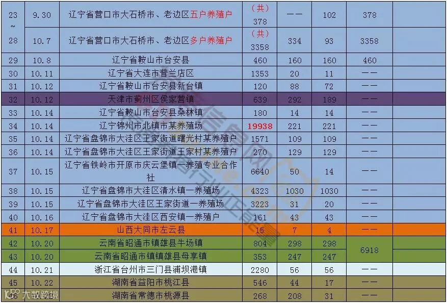 截至10月23日中午,农业农村部已通报46起疫情,涉及辽宁(18起)、河南(2起)、江苏(2起)、浙江(2起)、安徽(8起)、黑龙江(2起)、内蒙古(4起)、吉林(2起)、天津(1起)、山西(1起)、云南(2起)、湖南(2起)等12个省份。