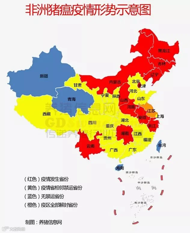 不能调运生猪的疫情省:辽宁、河南、安徽、黑龙江、内蒙古、吉林、天津、山西、云南、浙江、湖南。