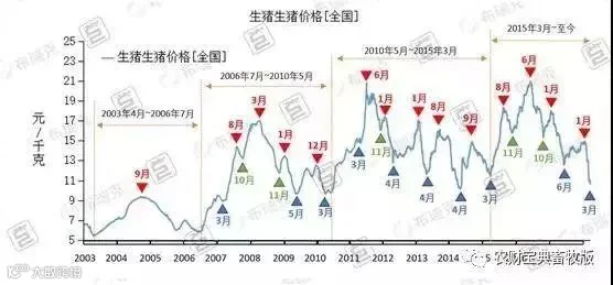 对2003年—2018年猪价最高及最低点进行标记,发现:
