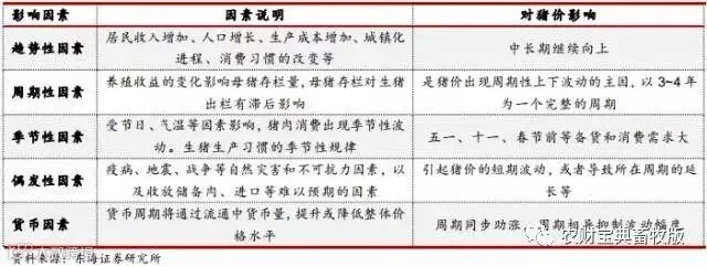 影响我国猪价的五大因素是: 趋势因素、周期因素、季节因素、偶发因素、货币因素。其中,周期性因素是判断猪价走势最为重要的研究内容。随着饲料成本、人工成本、土地成本的上涨趋势,生猪价格重心未来将不断上移。每年第三季度和春节前是猪肉消费的旺季,猪价会有不同程度的上扬。疫病、政府调控等偶发性因素影响边际供给,会导致所在周期的延长等。货币投放量会影响猪周期波动幅度。