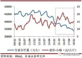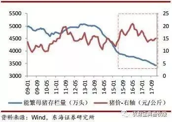 环保政策加严下的猪周期较前几轮周期不同。在环保去产能的背景下,大量散户退出,行业集中度提升。能繁母猪存栏量从2014年开始就一路下行,并没有因为2015-2016年猪价的上涨而回升。同时,在母猪存栏量低位的情况下猪价从2016年5月开始大幅下行。生猪存栏量和猪价也产生背离。