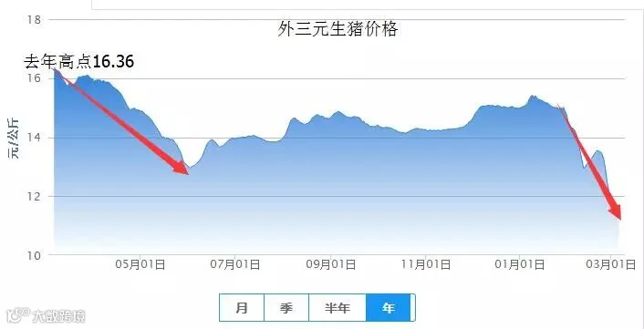 根据中国养猪网猪价系统显示,生猪价格去年同期为16.36元/公斤。虽今年并没有达到去年高度,但是从去年走势来看,去年猪价从春节之后也处在下跌状态,去年跌势一直维持到了6月1日低点。