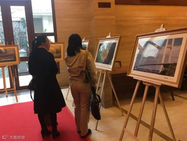 与会嘉宾认真欣赏着港珠澳大桥摄影作品