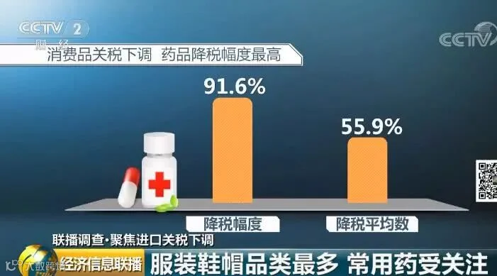 此次降税商品涵盖食品、服装鞋帽、家具用品、日杂百货、文体娱乐、家用电子、日化用品、医药健康等8类日用消费品,降税目录中,鲜活类商品降税的税目达到258个,占比达18%。此外,尽管药品类税目数量不多,但是降税幅度却高达91.6%,因此受到消费者最广泛的关注。