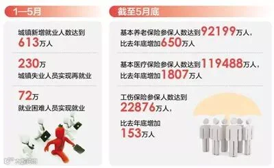 “稳”体现在越来越多的劳动者找到工作,就业规模持续扩大。今年1—5月,城镇新增就业人数达到613万人,还有230万城镇失业人员实现再就业,72万就业困难人员实现就业。
