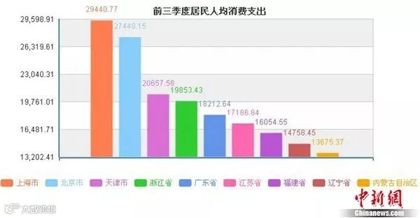 在31个省区市中,上海、北京、天津、浙江、广东、江苏、福建、辽宁、内蒙古的前三季度居民人均消费支出超过全国平均水平。