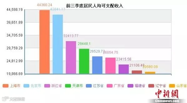 其中,上海前三季度居民人均可支配收入最高,达到44360.24元;北京排名第二,居民人均可支配收入为42641.17元。这两地也是前三季度全国仅有的居民人均可支配收入超过4万元大关的地区。