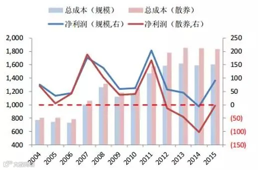 猪周期伴随着规模化程度的不断提高,也意味着行业养殖水平的提升。 从 2010年至 2015 年,规模化养殖(出栏 500 头以上)出栏占比提升了 10 个百分点。经过这一轮环保整治的净化,小散养户加速退出,我们认为原先规划的 2020 年实现规模化程度 52%的目标很可能超前完成。规模户养殖水平与散养户有明显差异,市场也顾虑规模户占比快速提升的背景下, 温氏竞争优势是否会被减弱。