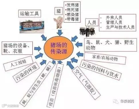 对猪健康威胁最大的是另一头猪,特别是一头病猪,或正在排毒(菌)的猪。发病猪、潜伏感染猪、康复猪都可能通过不同途径排毒(如消化道、呼吸道、泌尿生殖道),污染空气、栏舍、饮水或饲料,通过直接接触或间接接触,感染健康猪。不同的疾病排毒时间不一,如蓝耳病病毒可以持续150天的排毒,蓝耳病弱毒苗也可以排毒,不同毒株排毒持续时间不同,在20~30天不等。