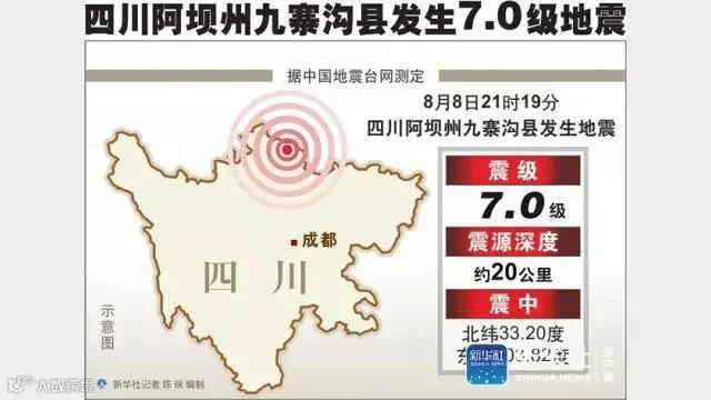 中国地震台网正式测定:08月08日21时19分在四川阿坝州九寨沟县(北纬33.20度,东经103.82度)发生7.0级地震,震源深度20千米。