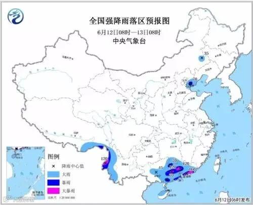 预计12日08时至13日08时,西藏东南部、云南西部、湖南南部、广西中东部、广东大部、海南岛北部等地有大雨或暴雨,其中,云南西部、广东北部和南部沿海局地有大暴雨(100~160毫米)。上述部分地区并伴有短时强降水(20~40毫米,局地70毫米以上),局地有雷暴大风。