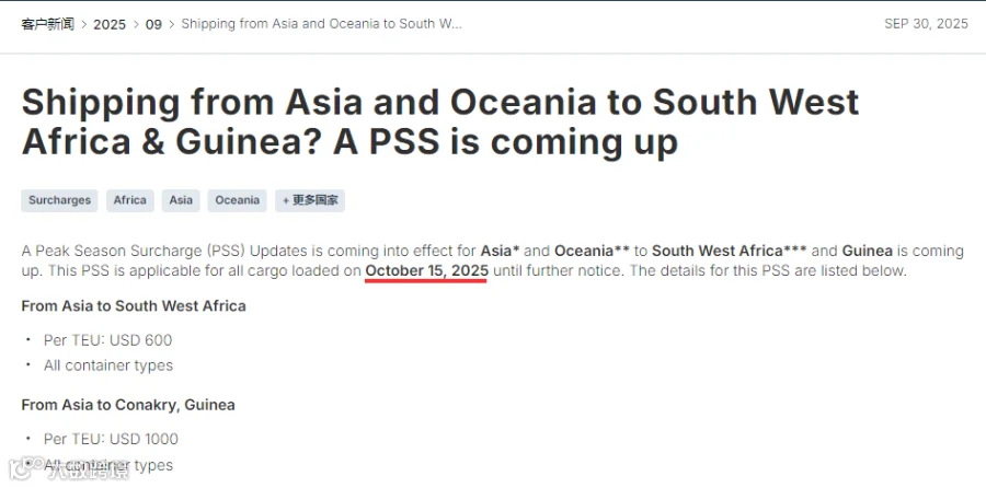 赫伯罗特宣布,从亚洲和大洋洲到西南非洲和几内亚,调整征收旺季附加费PSS,2025年10月15日装载的所有货物,直至另行通知。