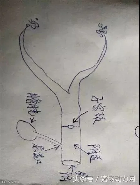 大家看下面这张简图,就一目了然了。这是一个母猪的生殖系统的图示,附着在阴道壁上的尿道口,在公猪迅猛交配的时候,公猪的阴茎把母猪的尿道口戳破。这个时候母猪因疼痛前冲拒绝交配。同时,尿道口处血管丰富,一但被阴茎刺破,便有大量血液流出。
