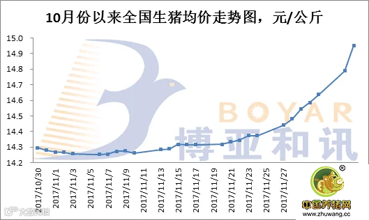 11月份猪价开始慢涨,进入12月份猪价涨幅加快,截止到5日,全国猪价日涨幅由0.05/公斤提高到0.15/公斤,均价14.95元/公斤,目前多地区已纷纷破15,浙江、江苏等局地破16,创5月初以来新高。后市全国猪价待破15元/公斤后,挺价与压价并存,调整后或再迎新高。