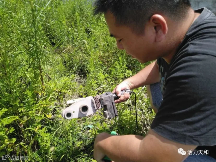 2018年8月22日浙江天和新材料有限公司员工刘峰、李灵君、张增辉、周林顶着烈日为工地安装自来水管。