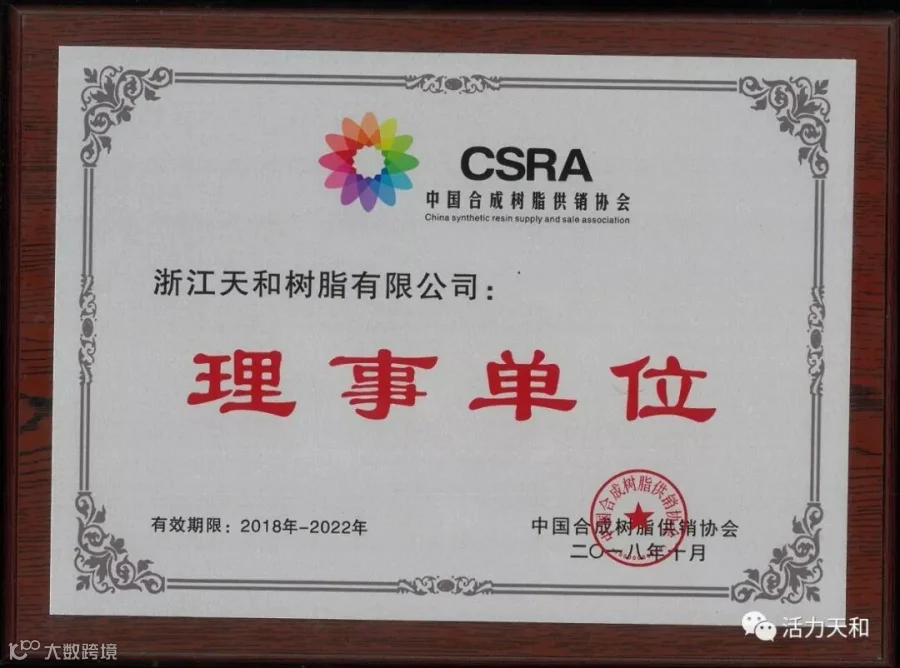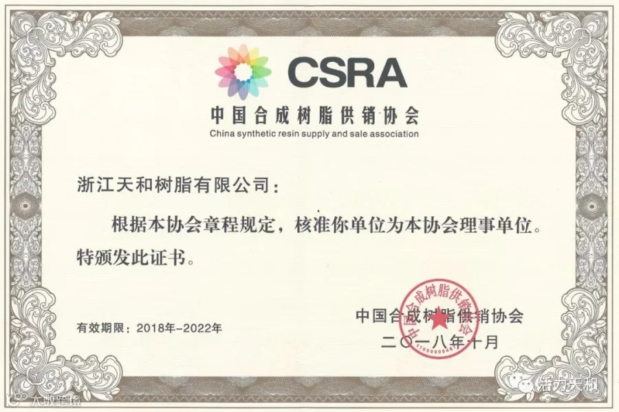 2018年2月6日,浙江天和向中国涂料工业协会递交入会申请,12月26日收到了中国合成树脂供销协会寄送的荣誉证书,成为该协会理事单位。