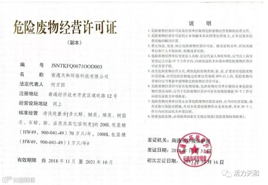 南通天和环保科技有限公司是一家危废处置单位,公司原有的危废经营许可证只有一年的有效期,已到期需换领。公司在2018年9月向南通市经济技术开发区环保局提交了换证申请并在2018年10月31日换证成功,取得了三年的经营许可。该新证有效期为2018年11月1日至2021年10月。