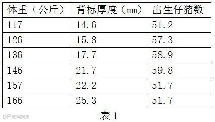 后备母猪不应生产过快,而应使其在一段时间内均衡发育。以获得最长利用年限和最佳繁殖力。配种时,青年母猪表现体况良好。不仅体重而且背标厚度都要求能在以后的生产中获得良好的生产效果。表1;初配时体重和背标厚度对母猪前5个生产周期影响: