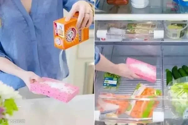 将小苏打倒在海绵上放冰箱,有效清除冰箱里的异味,简单又方便。