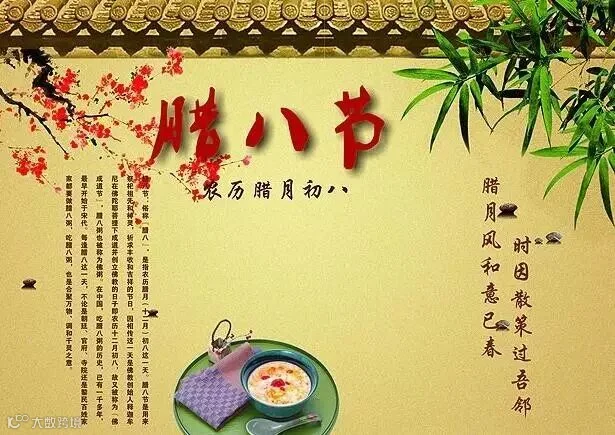腊八这一天有喝腊八粥、泡腊八蒜的习俗,腊八粥又称"七宝五味粥"。我国喝腊八粥的历史已有一千多年。最早开始于宋代。每逢腊八这一天,不论是朝廷、官府、寺院还是黎民百姓家都要做腊八粥。到了清朝,喝腊八粥的风俗更是盛行。在宫廷,皇帝、皇后、皇子等都要向文武大臣、侍从宫女赐腊八粥,并向各个寺院发放米、果等供僧侣食用。