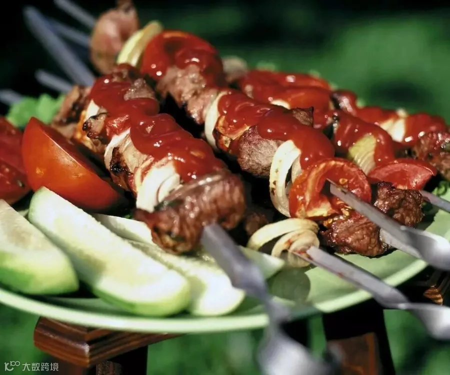 9、与腌制入味的肉块,相间穿成大串,多大以烤架大小而定