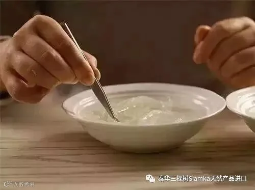 准备好2-3个小碗,装入少许的水,用镊子与网罩,将燕窝中的小毛与杂质慢慢去除。(最常用的方法)