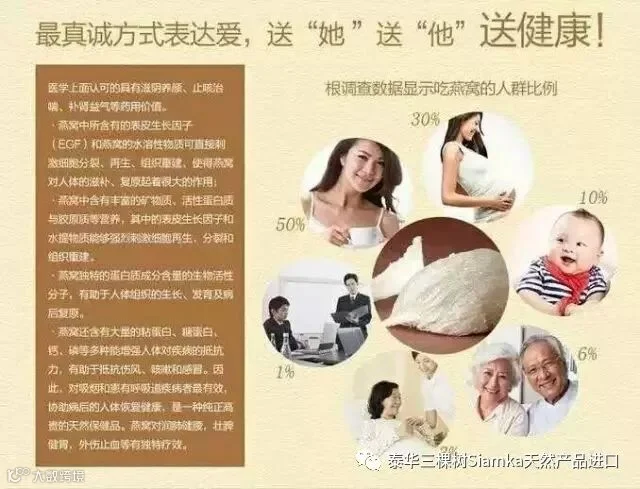 根据报导,在新加坡,有一半以上的孕妇食用各种燕窝制品,以确保未来的宝宝更健康,避免让自己的宝宝输在起跑点上。事实证明,孕妇在生产前两三个月食用燕窝,不仅能使母亲身体强健,而且能使未来的新生婴儿更强壮、更白皙、更漂亮、更不易生病。产后的妇女,要缓解哺育孩子的劳累,要恢复生产前窈窕的身姿,燕窝是最佳的天然滋补食品。其性味甘、平,对孕妇和产後妇女而言,补而不腻,没有任何不良反应。