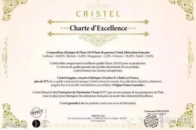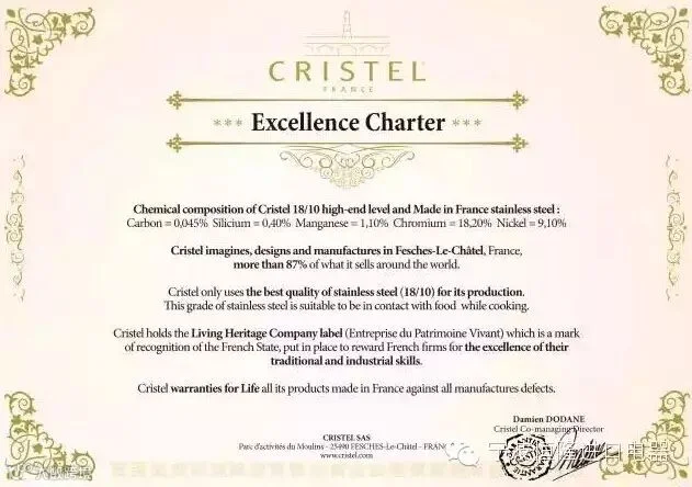 CRISTEL锅具原产法国,采用18/10不锈钢生产而成,化学成分: